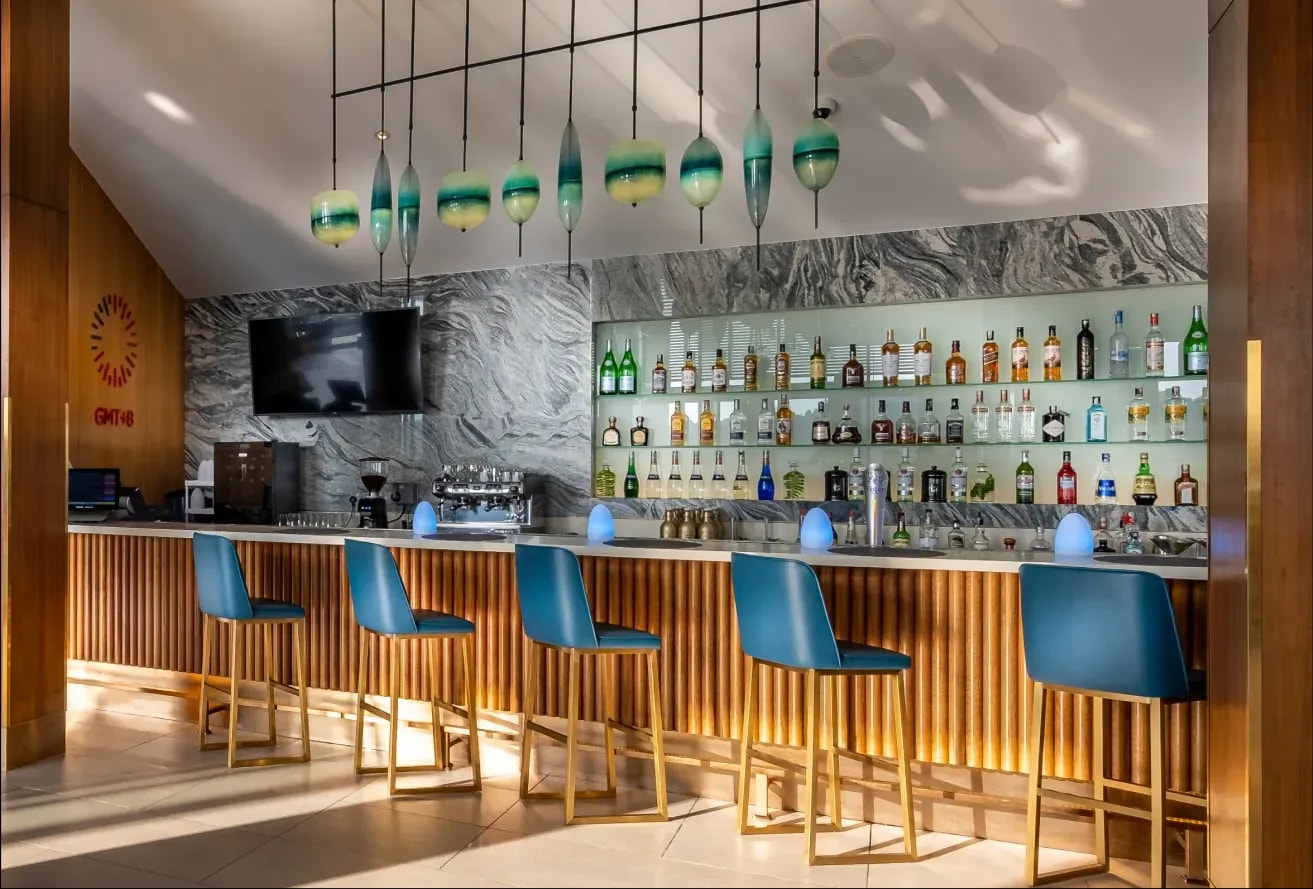 Chill out at a cosmopolitan lobby bar with a sweeping window view of the poolside lined with swaying palm trees for a welcoming holiday vibe.